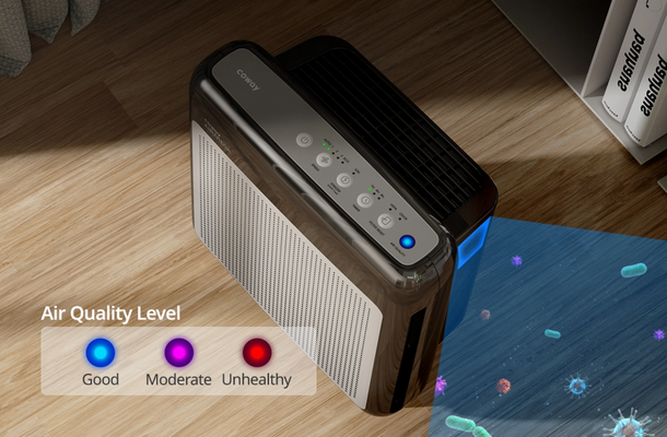The pollution monitor indicates air quality throughout the day, adjusting purification to the necessary level.