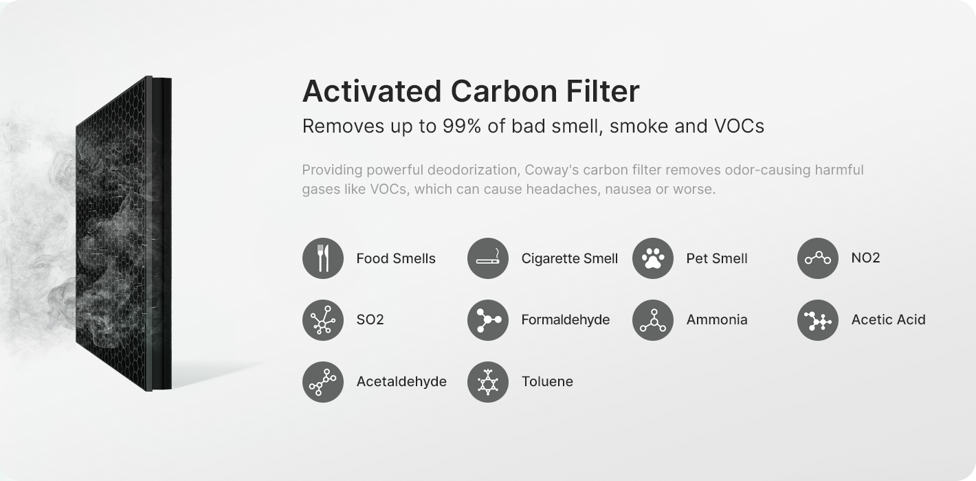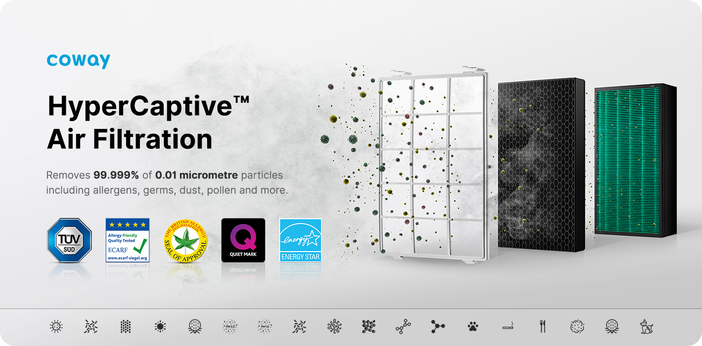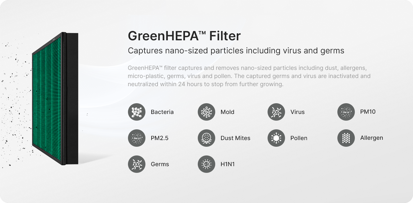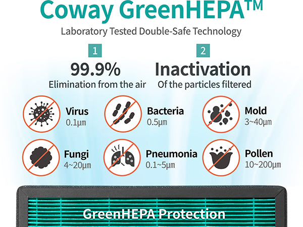 ² 99.9% of viruses, bacteria, fungi, and pollen were verified to be removed from the air by Coway air purifiers with GreenHEPA™ technology applied filters based on the Japan Food Research Laboratories (JFRL) testing according to JEM 1467 standard. Tested with AIRMEGA AP-1516D, AIRMEGA AP-1220B, AIRMEGA MIGHTY air purifiers and additionally AIRMEGA 100, AIRMEGA 150, AIRMEGA 250, AIRMEGA 300S, AIRMEGA 400S will acquire the test report in 1H, 2022.
