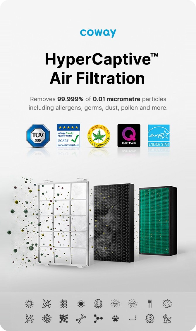 ² 99.9% of viruses, bacteria, fungi, and pollen were verified to be removed from the air by Coway air purifiers with GreenHEPA™ technology applied filters based on the Japan Food Research Laboratories (JFRL) testing according to JEM 1467 standard. Tested with AIRMEGA AP-1516D, AIRMEGA AP-1220B, AIRMEGA MIGHTY air purifiers and additionally AIRMEGA 100, AIRMEGA 150, AIRMEGA 250, AIRMEGA 300S, AIRMEGA 400S will acquire the test report in 1H, 2022.