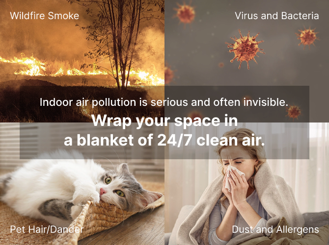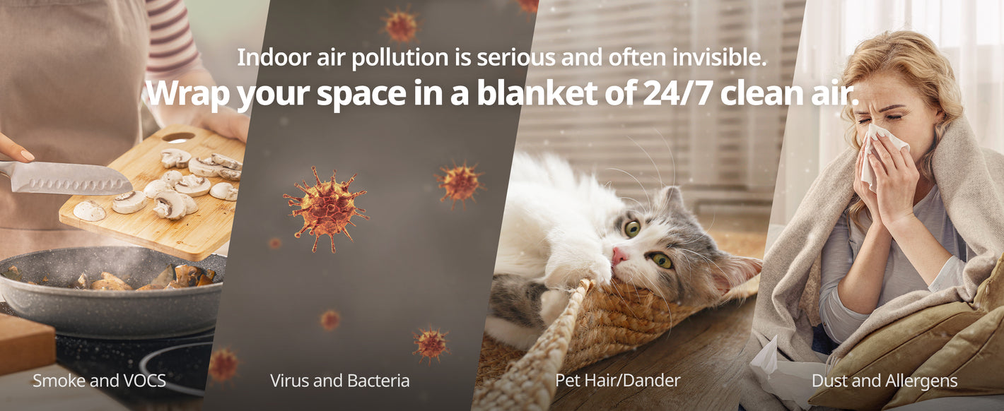 24/7 pollution monitor senses air quality throughout day, Adjusting purification to the necessary level, and saving energy When it’s not needed.