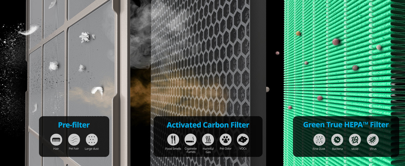 ² 99.9% of viruses, bacteria, fungi, and pollen were verified to be removed from the air by Coway air purifiers with GreenHEPA™ technology applied filters based on the Japan Food Research Laboratories (JFRL) testing according to JEM 1467 standard. Tested with AIRMEGA AP-1516D, AIRMEGA AP-1220B, AIRMEGA MIGHTY air purifiers and additionally AIRMEGA 100, AIRMEGA 150, AIRMEGA 250, AIRMEGA 300S, AIRMEGA 400S will acquire the test report in 1H, 2022.