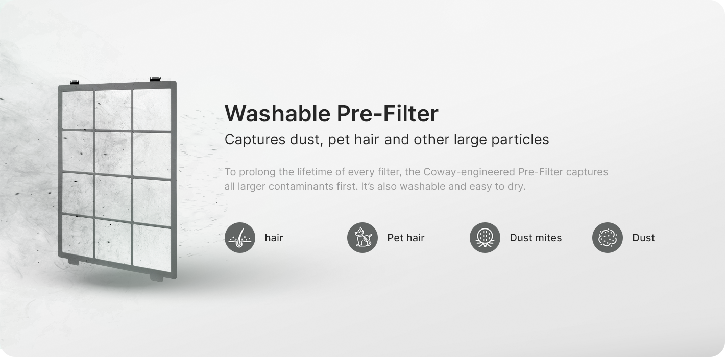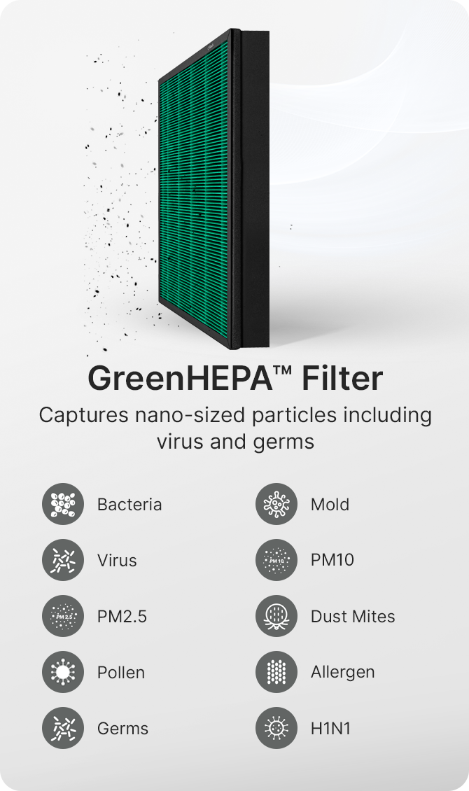 ² 99.9% of viruses, bacteria, fungi, and pollen were verified to be removed from the air by Coway air purifiers with GreenHEPA™ technology applied filters based on the Japan Food Research Laboratories (JFRL) testing according to JEM 1467 standard. Tested with AIRMEGA AP-1516D, AIRMEGA AP-1220B, AIRMEGA MIGHTY air purifiers and additionally AIRMEGA 150, AIRMEGA 250, AIRMEGA 300S, AIRMEGA 400S will acquire the test report in 1H, 2022.