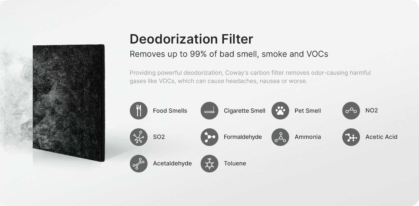 ² 99.9% of viruses, bacteria, fungi, and pollen were verified to be removed from the air by Coway air purifiers with GreenHEPA™ technology applied filters based on the Japan Food Research Laboratories (JFRL) testing according to JEM 1467 standard. Tested with AIRMEGA AP-1516D, AIRMEGA AP-1220B, AIRMEGA MIGHTY air purifiers and additionally AIRMEGA 100, AIRMEGA 150, AIRMEGA 250, AIRMEGA 300S, AIRMEGA 400S will acquire the test report in 1H, 2022.