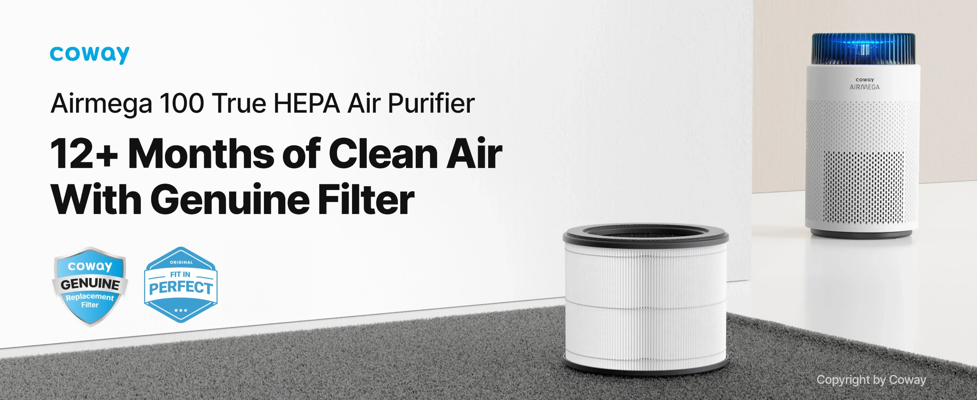 - [Genuine Replacement Air Filter] This Coway's genuine filter is for the air purifier Airmega 100. It's all-in-one HEPA filter that combines True HEPA filter technology with deordorization filter. Coway's genuine filters ensure higher efficiency and a longer lifespan. Wise purchase to take a healthy breath for 1 year.